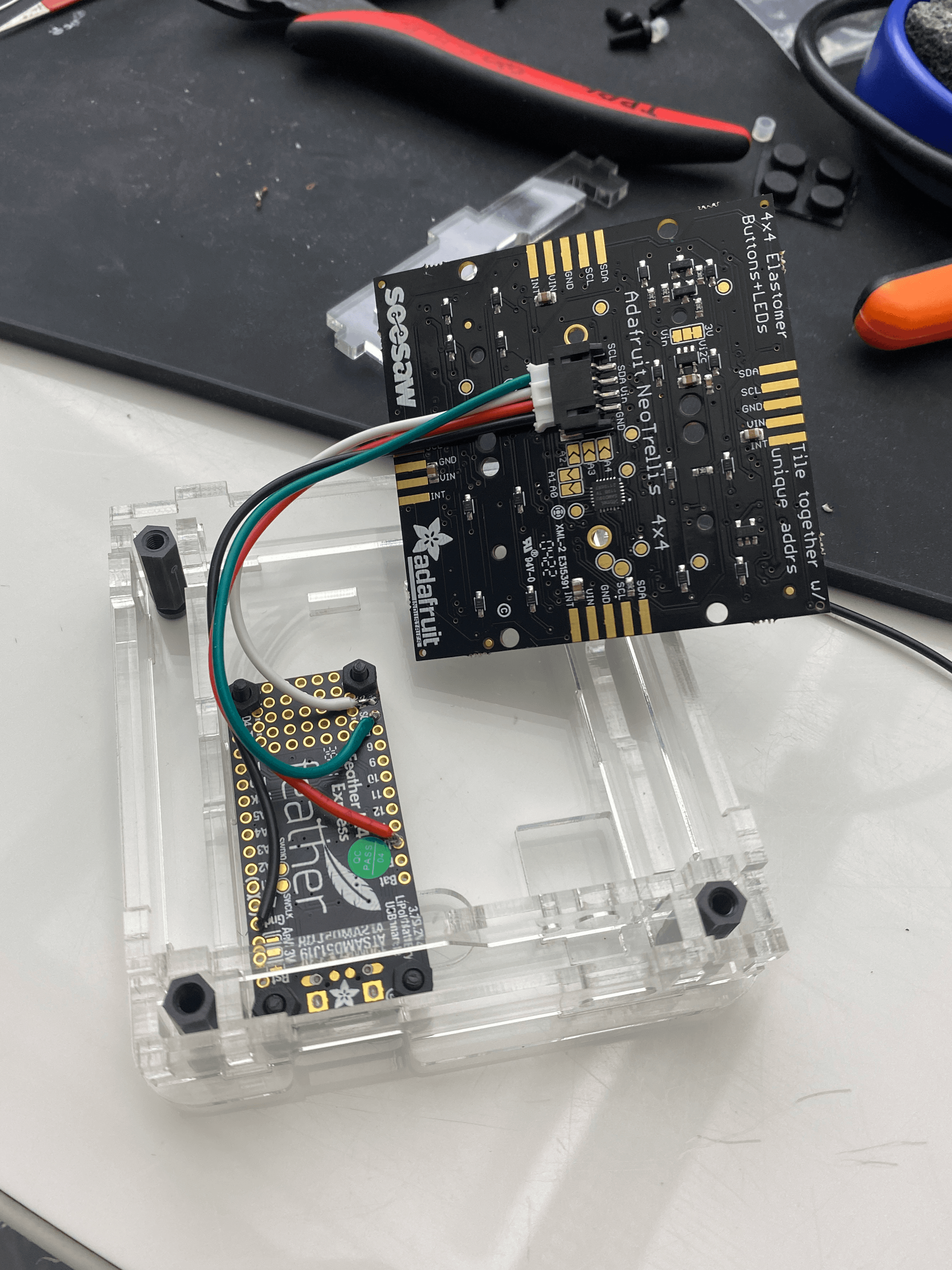 The toy is made using Adafruit NeoTrellis boards is coded in Arduino IDE.