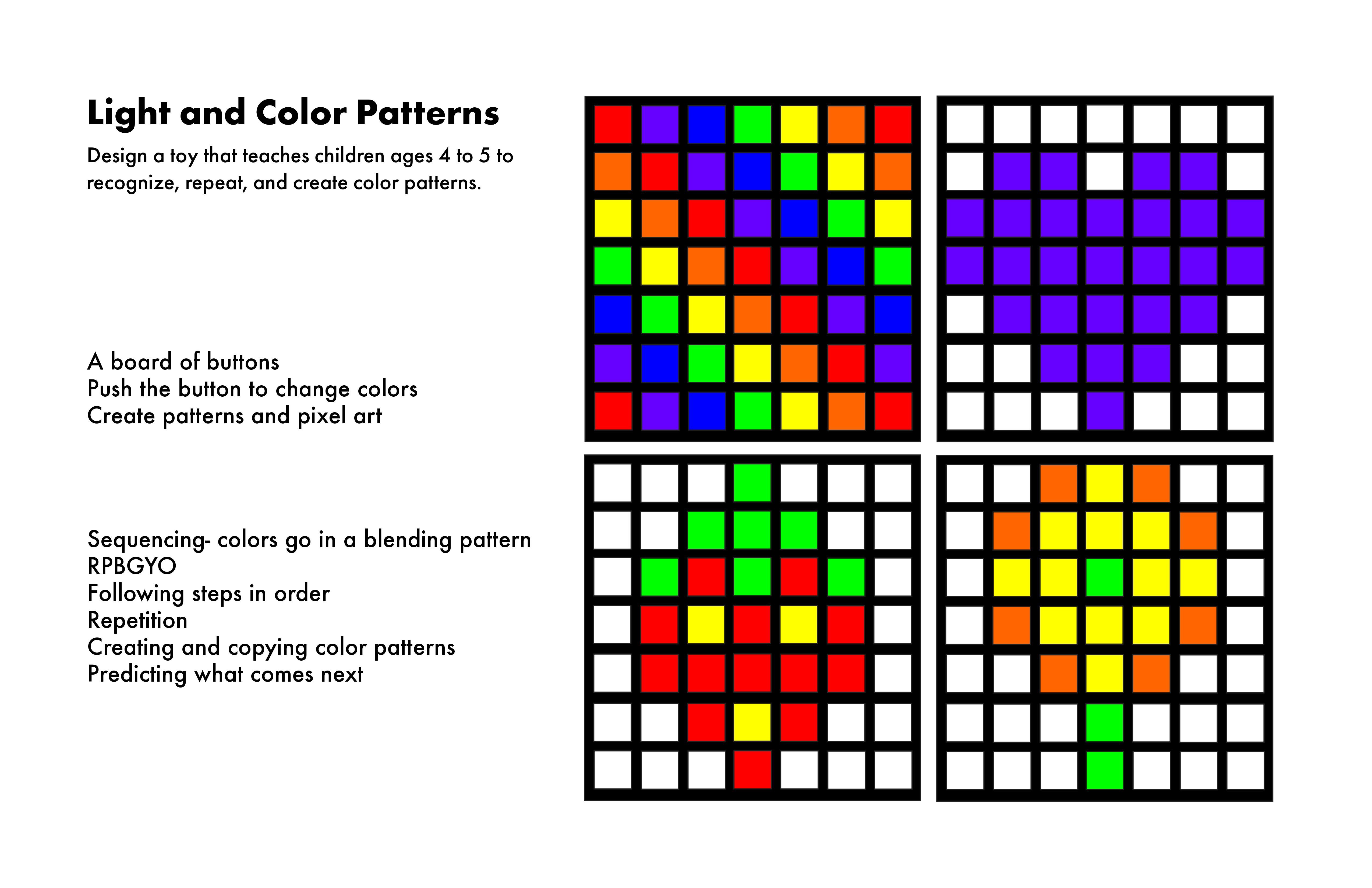 Design a toy that teaches 5 year olds to recognize, repeat, and create color patterns. The toy should support directed and undirected play and emphasize creativity.
