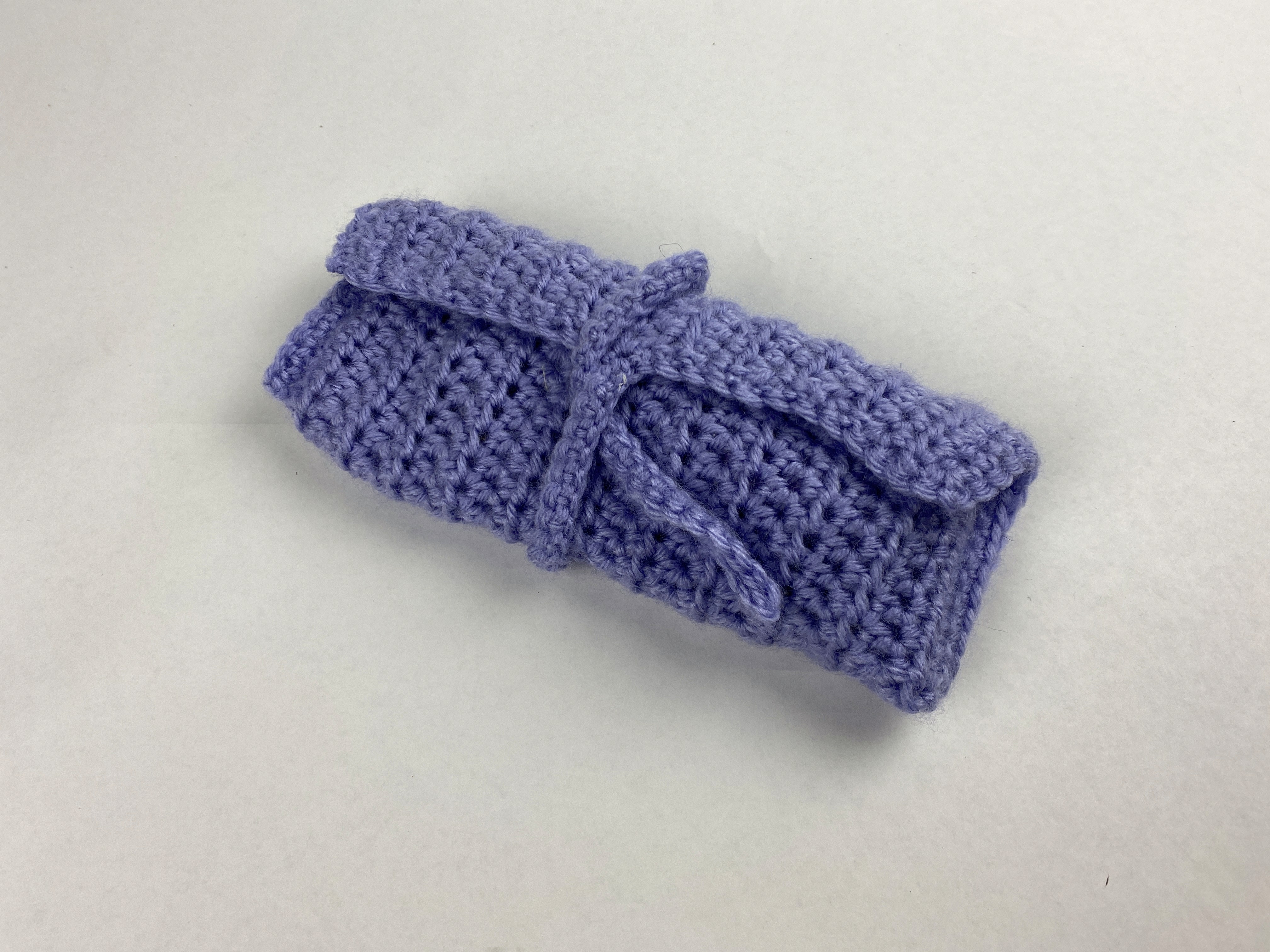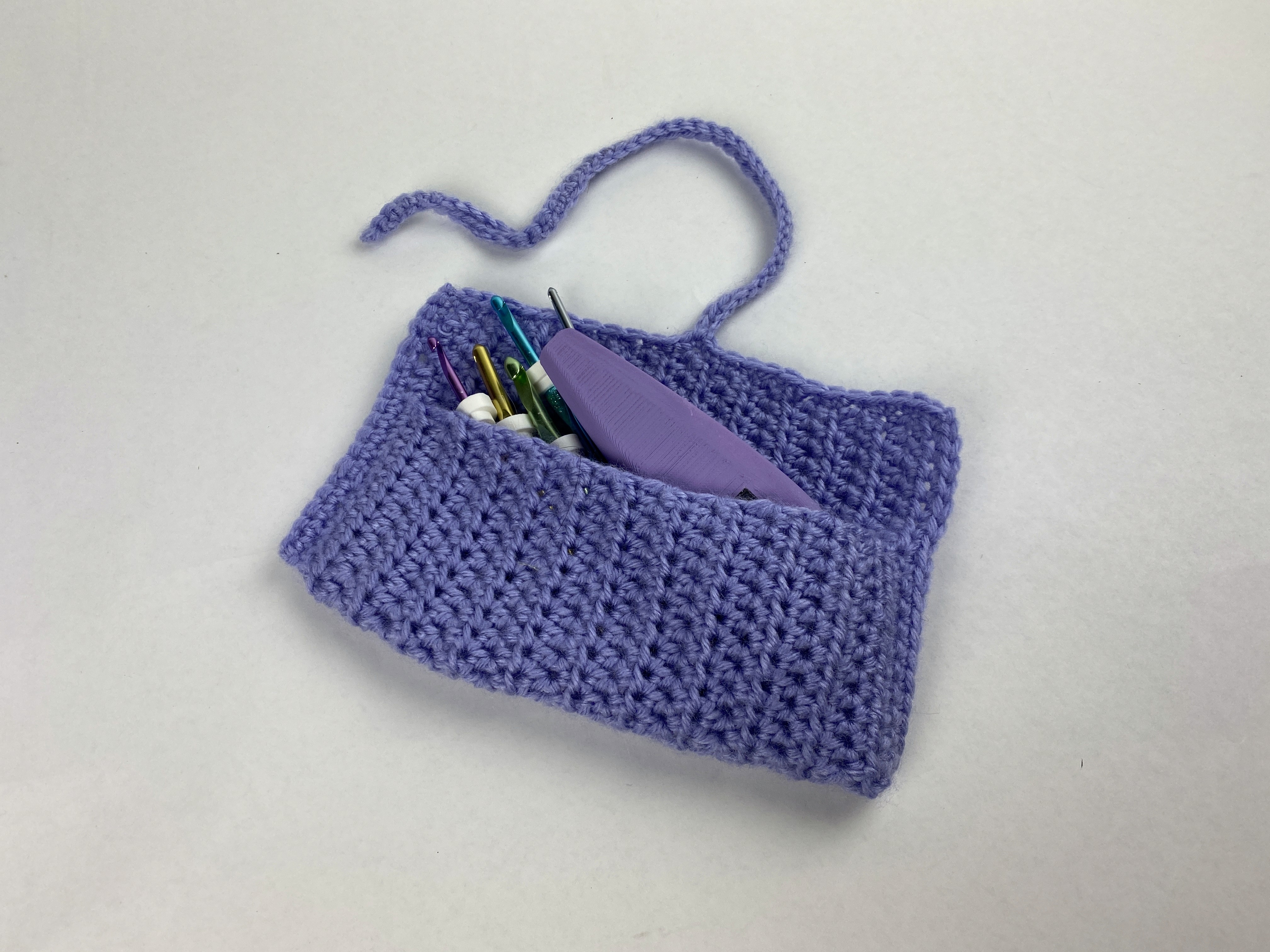 Count, a yarn needle, and a written pattern for a carrying pouch, and linked video tutorials for complete crochet beginners. The final