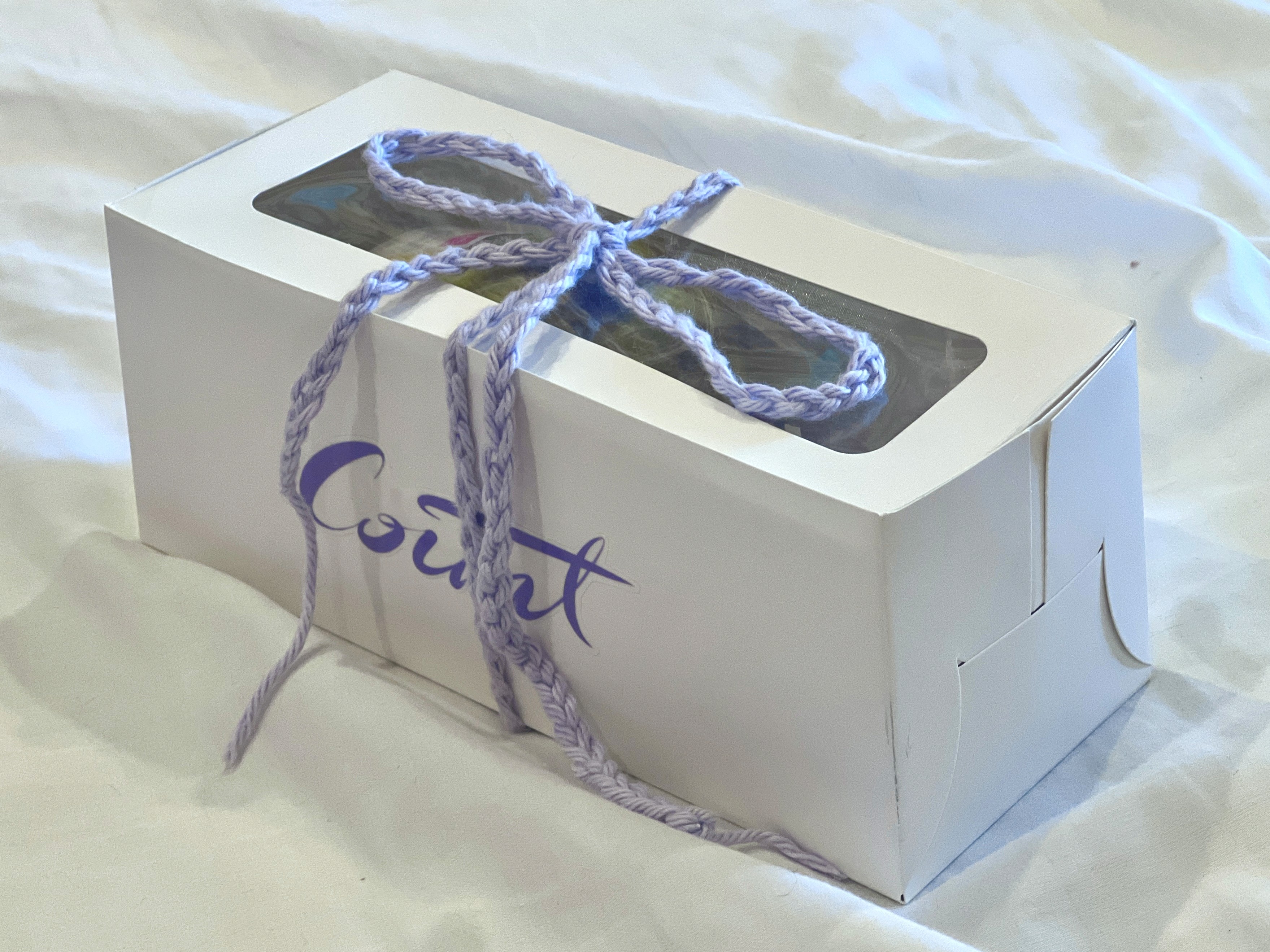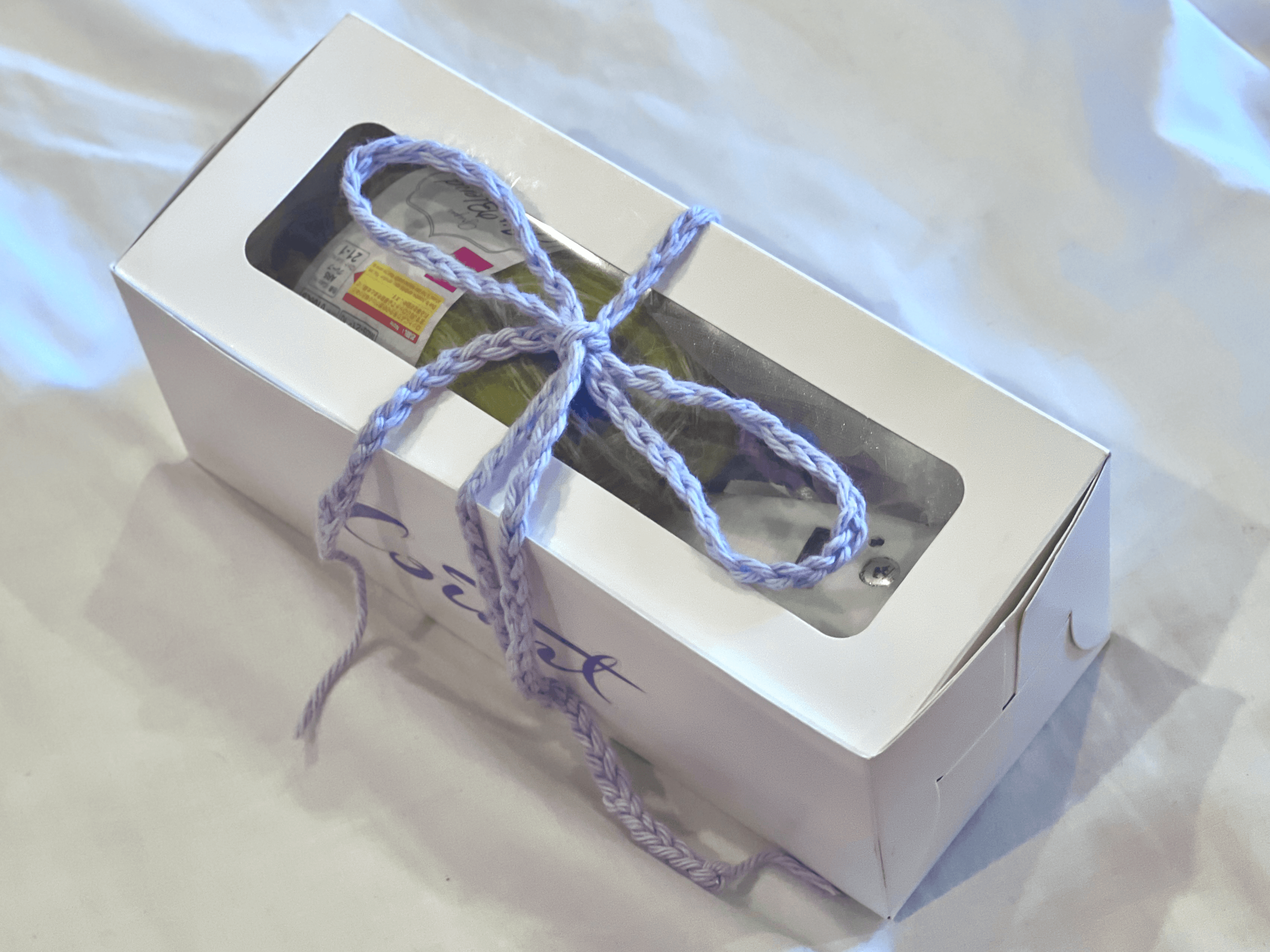touch involved wrapping the box with a crochet string made of purple yarn, tied into a bow.